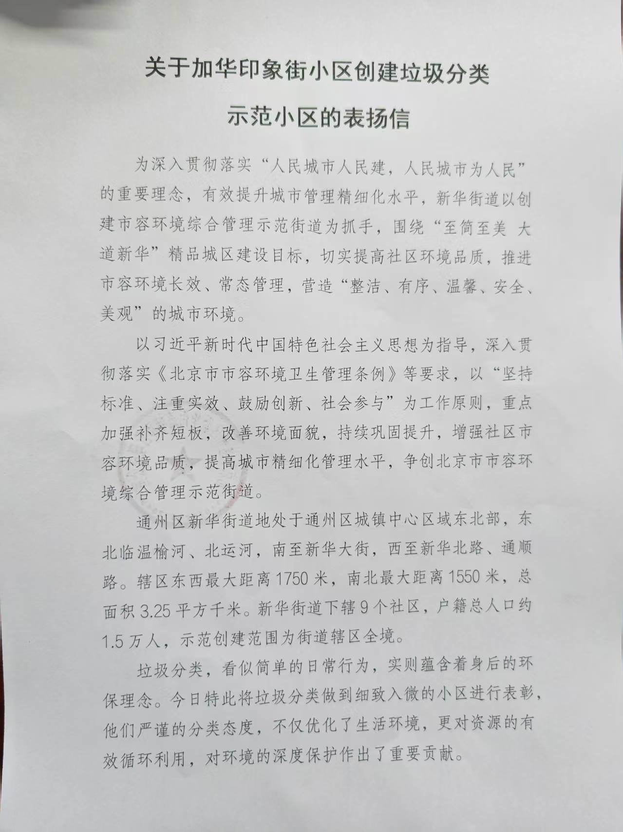 正是通过这些扎实有效的举措,我们欣喜地看到,小区居民的垃圾分类意识逐步提高,以往随意投放垃圾的习惯得到了扭转,广大业主也从最初的被动接受转变为主动配合。加华印象街现已成为通州区新华街道最早获评 “垃圾分类示范小区” 的社区之一。在后续的日常管理中,我们持续保持高标准运维,不断巩固垃圾分类工作成果,让小区环境始终保持整洁、有序。