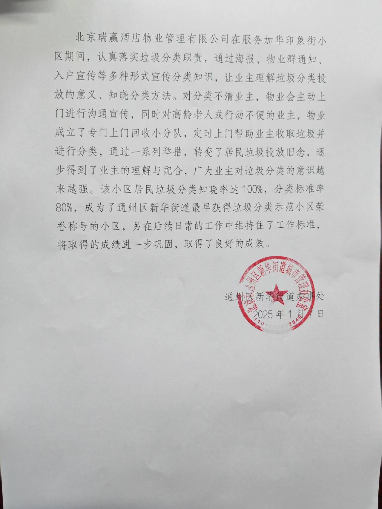 回顾这几年在加华印象街小区的服务历程,我们感慨万千。每一项成绩的取得,都离不开新华街道的正确指导,离不开小区业主的支持与配合。未来,瑞赢物业将以此次获得的荣誉为新起点,继续秉持认真负责的服务态度,进一步细化垃圾分类工作流程,与新华街道、小区业主紧密协作,共同推动社区环境向更整洁、更温馨的方向发展。我们相信,在大家的共同努力下,加华印象街小区的明天一定会更加美好!